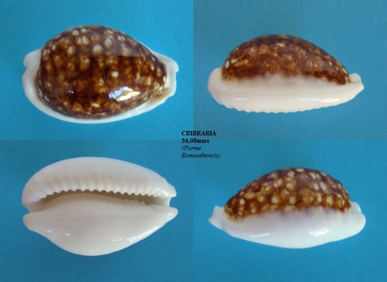 CRIBRARIA (Forme Exmouthensis) Taille : 36,08 mm Découverte : Année 1997 Provenance : Nouvelle-Calédonie Sud-Ouest, Prony, Rade Ouest Propriétaire : Webmestre Disponibilité : Disponible |